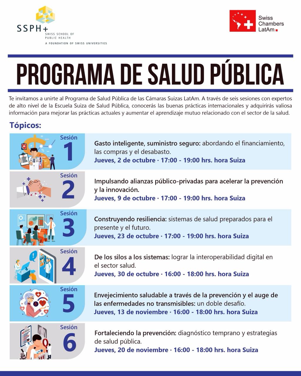 Diplomado Online en Salud Pública: últimos días para inscribirse. No pierdas la oportunidad de capacitarte en #saludpublica #innovaciónensalud con expertos de las mejores universidades de Suiza. La Cámara de Comercio Suizo-Uruguaya en conjunto con las Cámaras Suizas de la región y el Swiss School of Public Health (SSPP+) invitan a participar de este programa imperdible que te conectará con colegas de toda la región y ponentes de reconocida trayectoria a nivel mundial. Comienza el 2 de octubre de 12 a 14 hs. Se realiza en formato virtual, 2 hrs. semanales en inglés con traducción simultánea.